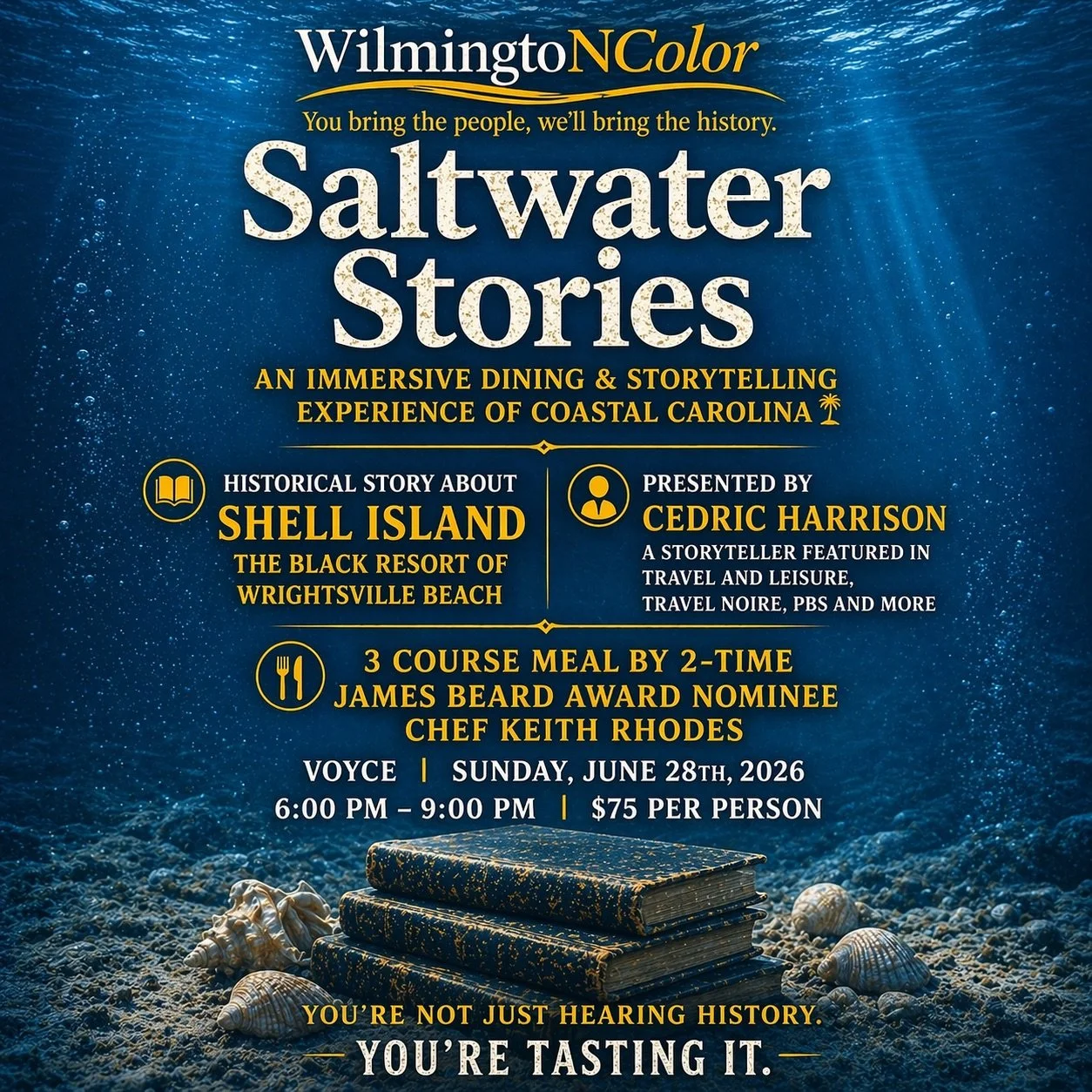 Wilmington, NC — WilmingtoNColor Heritage Tours & Voyce announces “Saltwater Stories: An Immersive Dining and Storytelling Experience of Coastal Carolina,” a one-of-a-kind cultural event blending culinary excellence with powerful historical storytelling at Voyce, the Black-owned restaurant led by two-time James Beard Award nominee Chef Keith Rhodes, also featured on Top Chef.